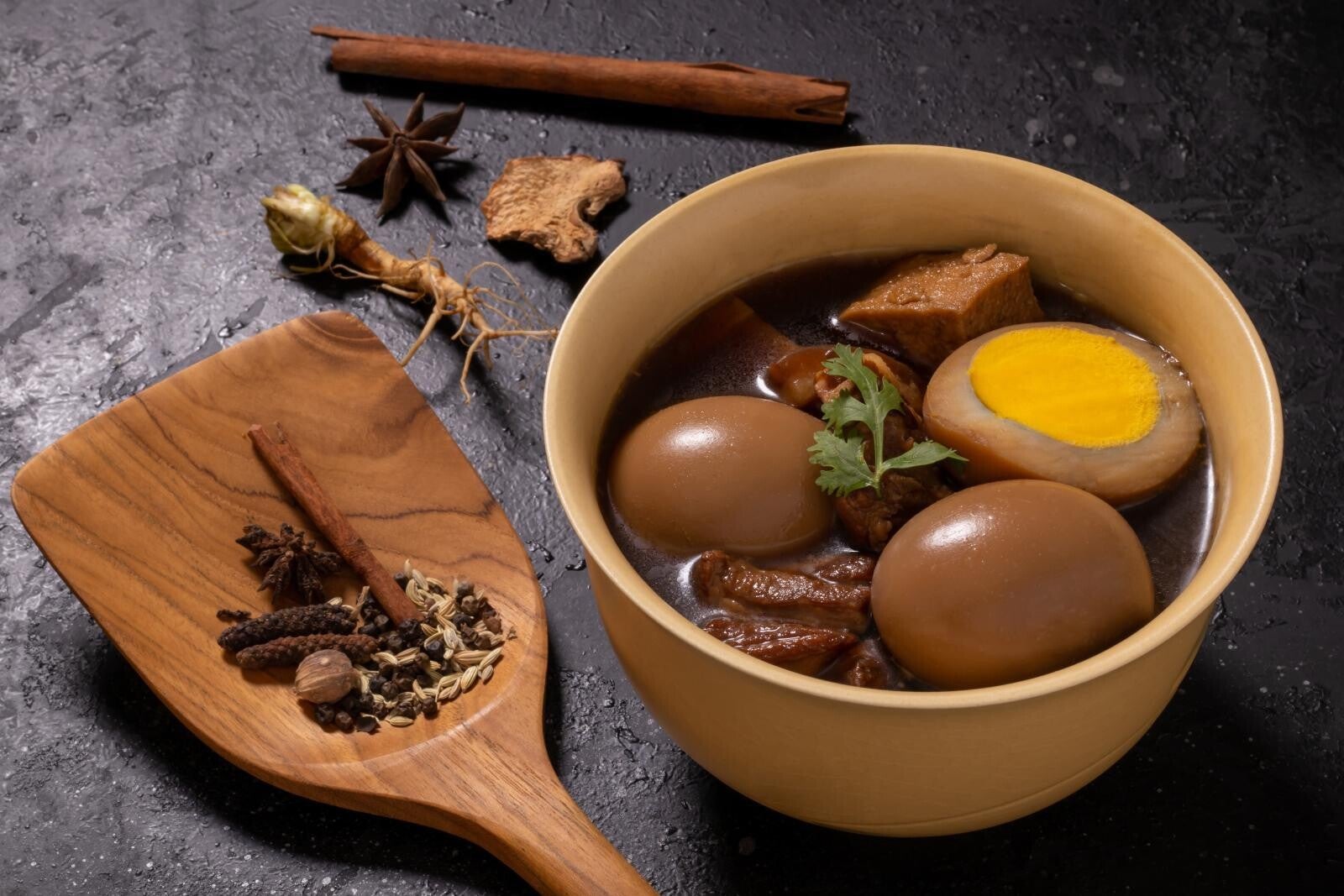 Eieren gestoofd in donkere sojasaus met palmsuiker, knoflook, korianderwortel, steranijs, kaneel en witte peper.