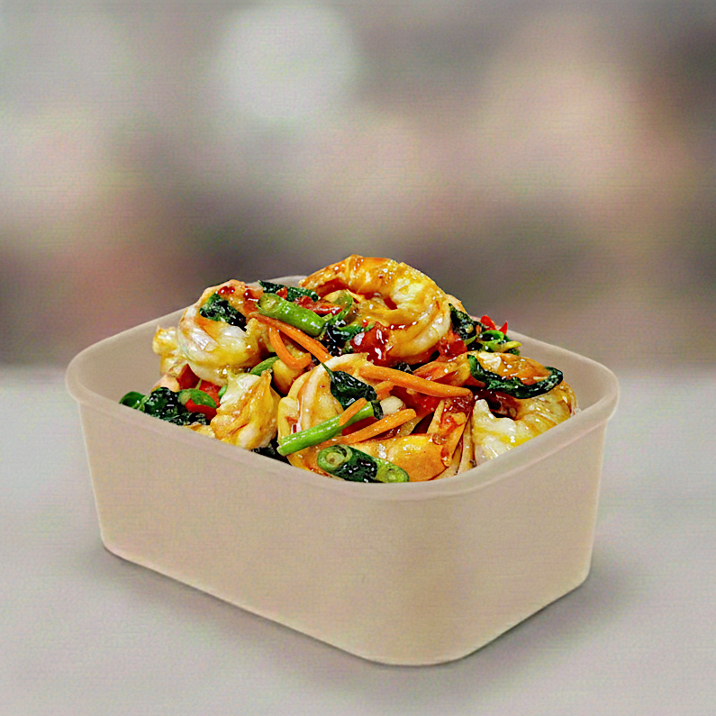 Pikant Thais roergebakken gerecht met vlees of tofu naar keuze, verse groenten, kousenband, uien, bosui en Thaise pittige basilicum.