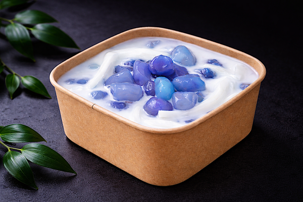 Gekleurde robijn van waterkastanje omhuld met rijstmeel, geserveerd met jackfruit in zoete romige kokosmelk.