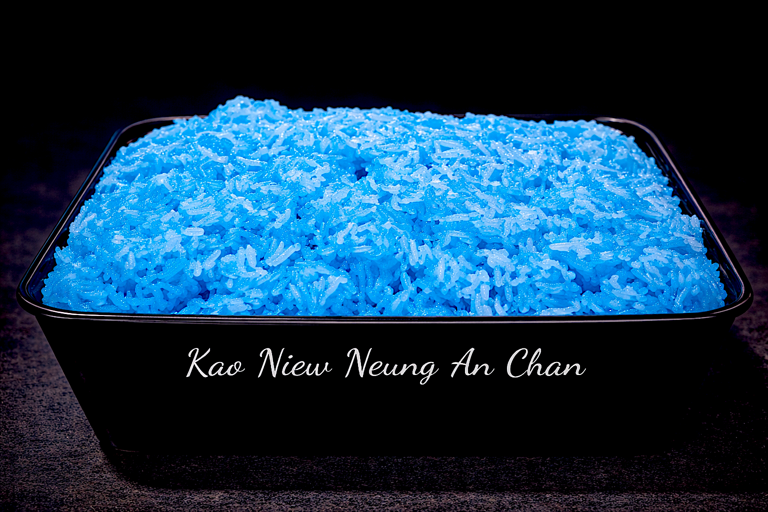 Thaise kleefrijst, natuurlijke kleurstoffen (butterfly pea, pandanblad, kurkuma).